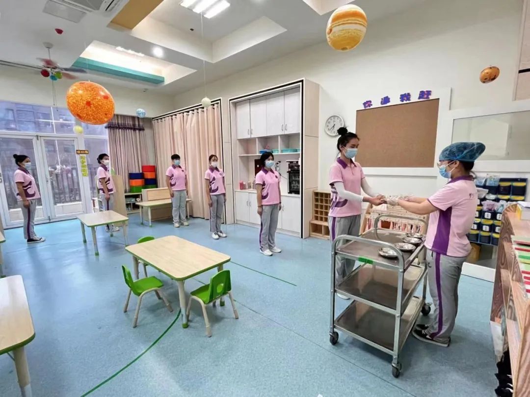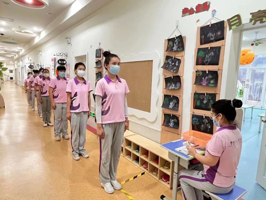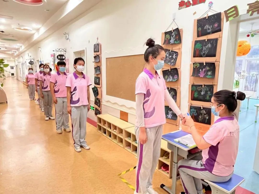 进入教室后,进行二次晨检,教师对每一位幼儿进行二次测温,口腔检查,以及手部等皮肤表面的观察,确定没有问题之后方可进入教室。