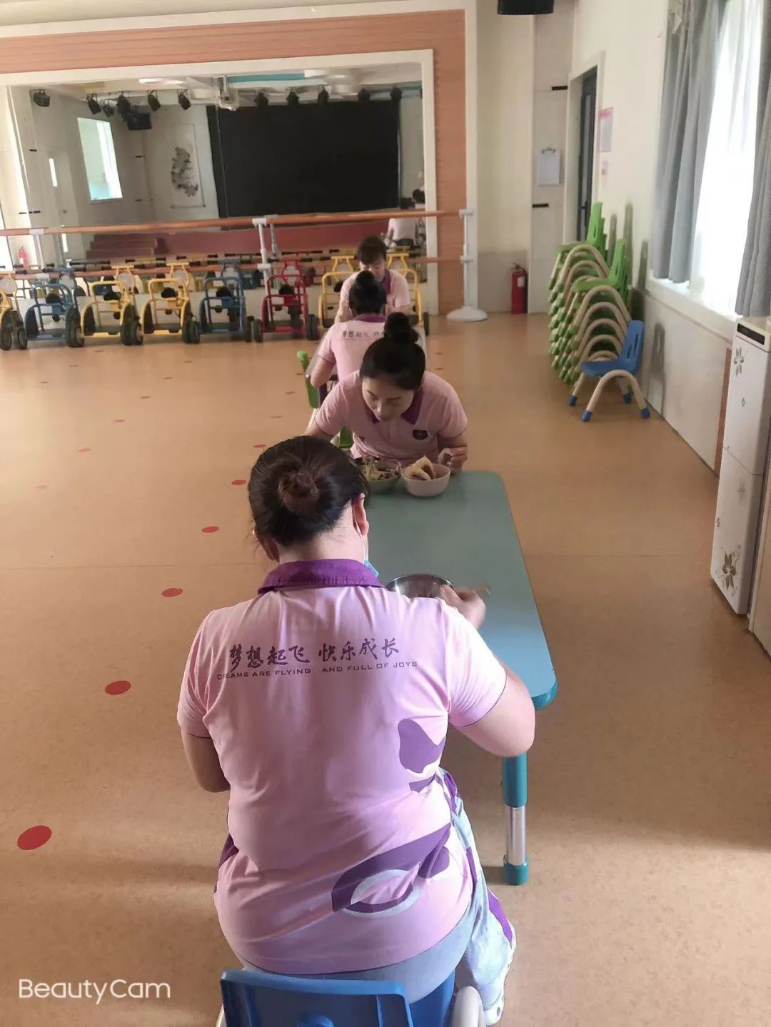 在教师打餐环节中,老师们也严格遵守一米距离,以身作则,戴好口罩,避免近距离接触,就餐时两人一桌,保持间隔。