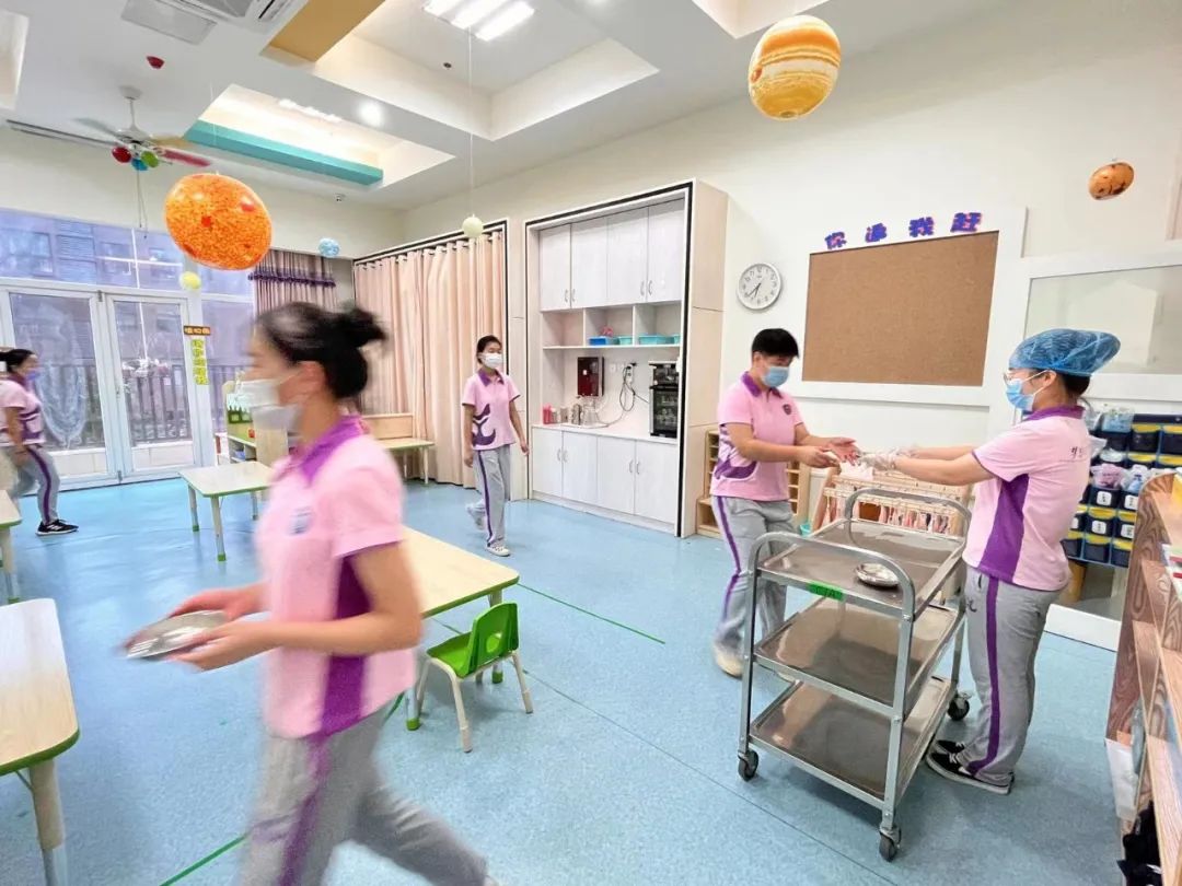 用餐结束后,佩戴好口罩,检查桌面保持干净,按一米距离排队,将剩饭菜倒进泔水桶,餐盘、餐具分类送到相应回收桶。