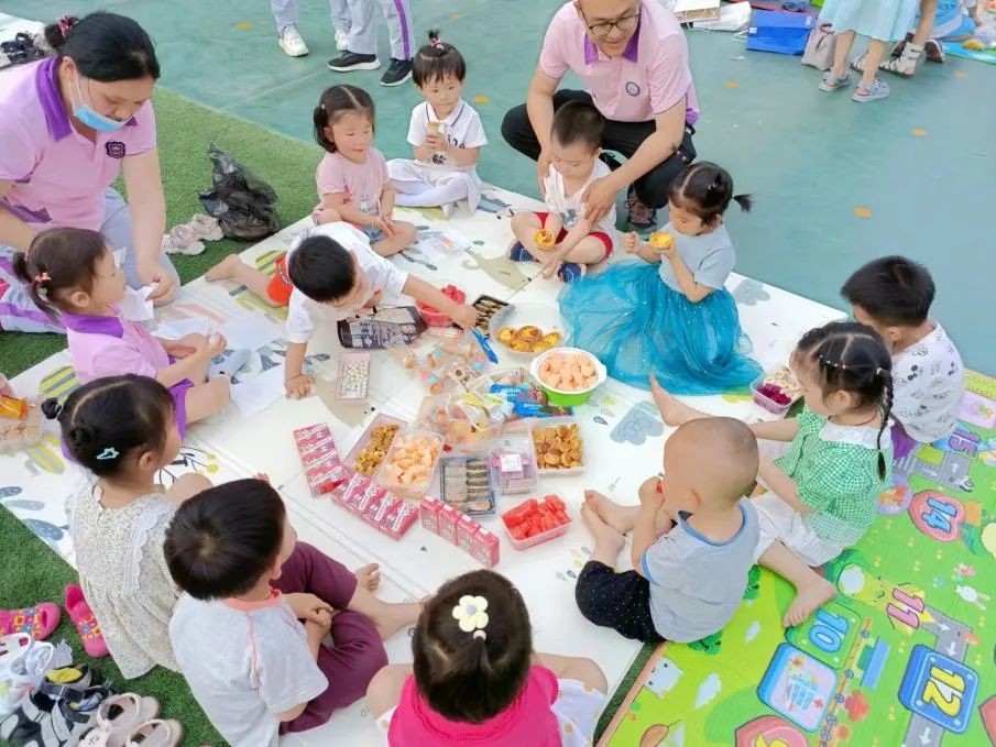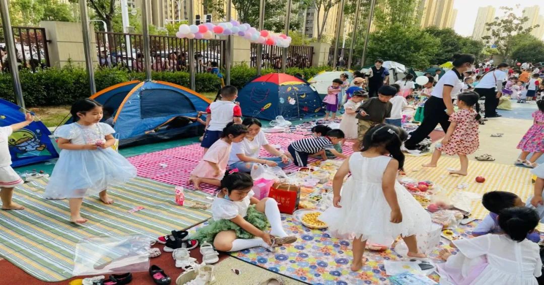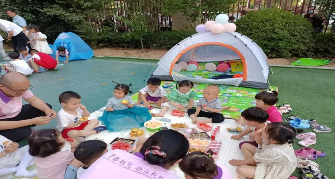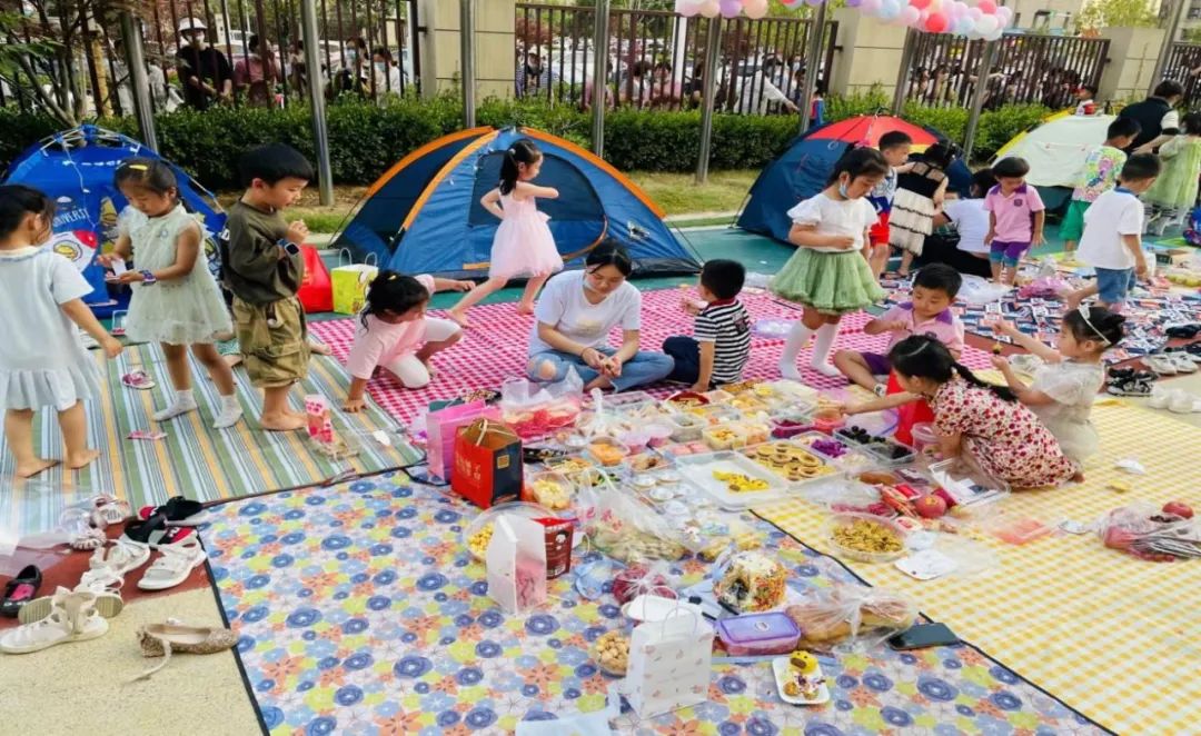 幼儿园宽敞的操场、碧绿的草地变成了孩子们的绝佳野餐地,帐篷、垫子、气球如数家珍。孩子们分享着美食,边聊边吃,其乐融融,和老师、小伙伴一起享受着节日的喜庆。