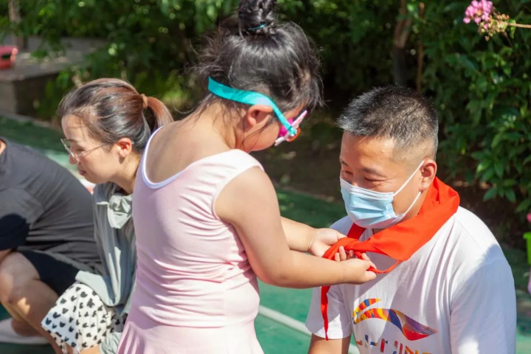 接下来就该由我们大班的哥哥姐姐们来给我们的大朋友们带上鲜艳的红领巾啦!