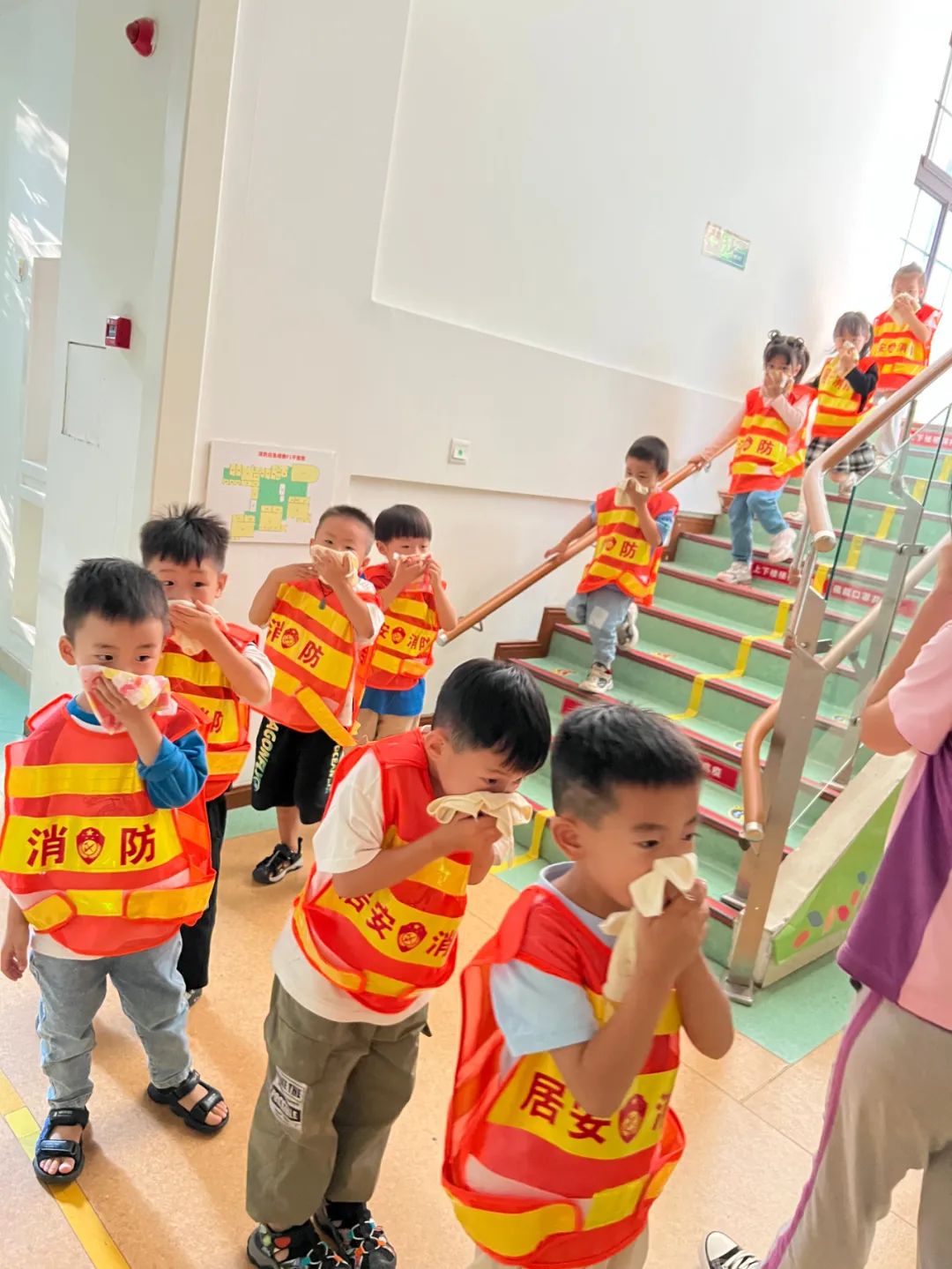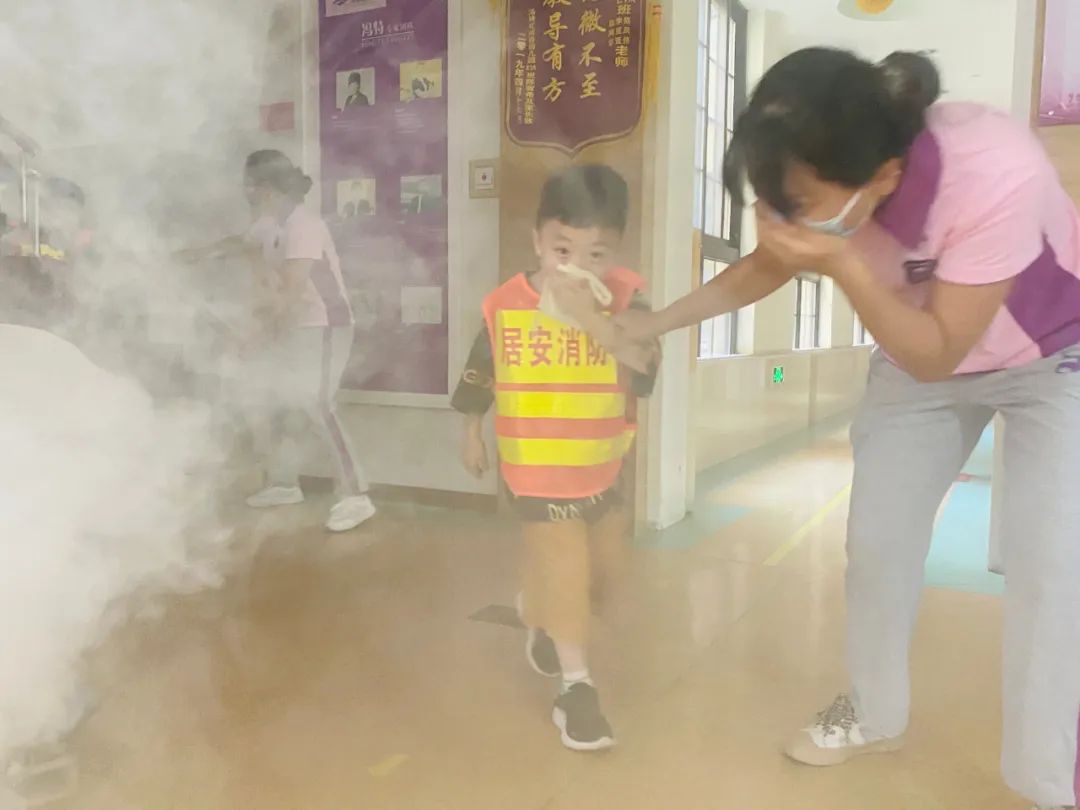 知识讲解后,随之而来的就是模拟消防逃生演练。当浓烟四起、警报声也随之响起,负责楼道和安全出口的教师迅速到位,各班教师迅速按照紧急预案的疏散线路带领幼儿捂住口鼻,弯腰小步快走,按照每个班级的安全路线进行撤离。