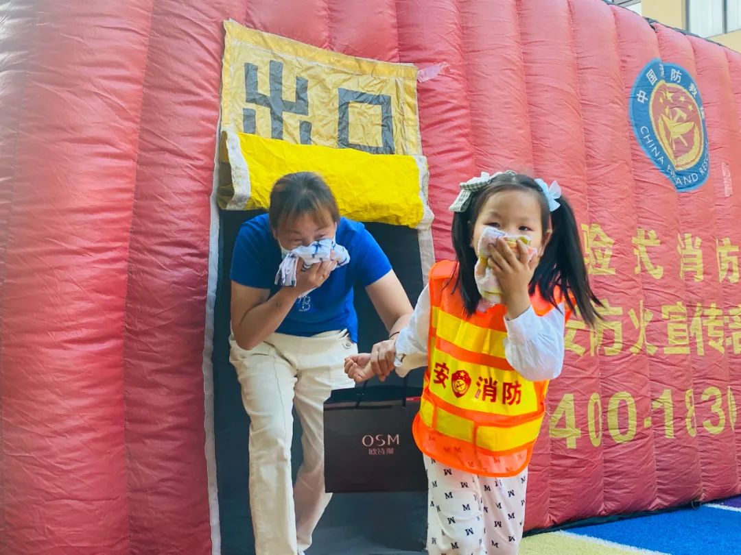 在教官的带领下,家长和孩子们共同体验了亲子模拟火灾逃生和现场灭火演练(在教官的安全讲解和指导下)。