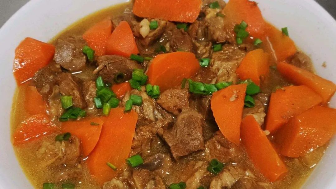 午餐:二米饭、红焖羊肉、耗油生菜、香菇炖鸭汤、