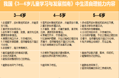 幼儿每天从起床开始,自己需要完成的事情有:穿衣服、洗漱、入厕、吃饭、整理图书和玩具等等 ,中大班的幼儿除了每天这些基本的自理内容,还可帮助父母做力所能及的事情。例如:洗手帕、摆碗筷、洗水果、浇花等等。